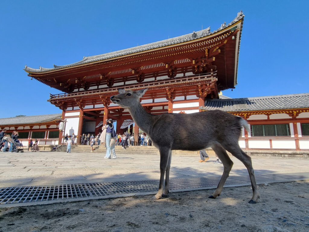 Nous avons fait une excursion d’une journée à Nara. Capitale du Japon au VIIIe siècle, c’est une ville à ne pas manquer quand on visite Kyōto ou Ōsaka. L’immense parc de Nara comporte de nombreux musées et temples, dont le Tōdai-ji, qui renferme une statue de Boudda de 15 m de haut. Le parc est aussi connu pour ses centaines de cerfs qui n’ont pas peur des humains. On peut acheter des biscuits pour les nourrir, et ils se laissent généralement caresser mais ils s’en fichent, ils veulent juste manger.